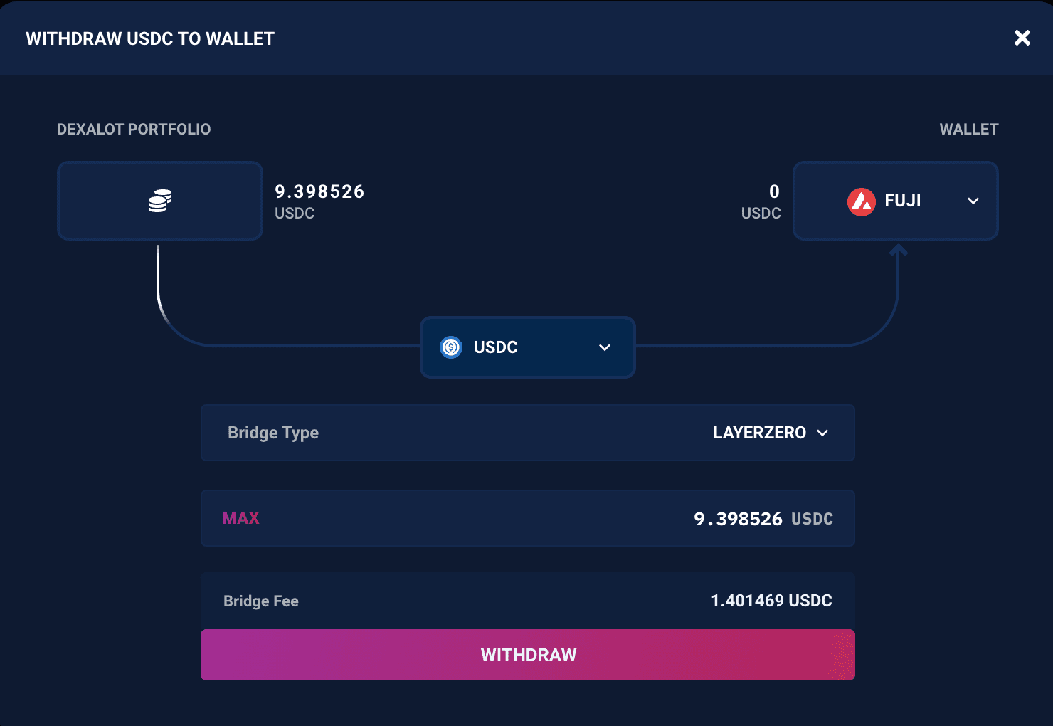 From the Balances tab, withdraw your AVAX and USDC back to the Fuji C-Chain by clicking on the "Withdraw To Wallet" option in the drop down menu: