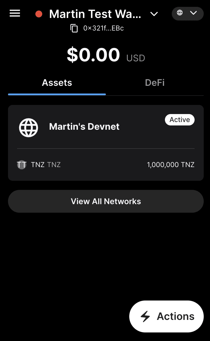 Click the Actions button and transfer some of the tokens to a random address (e.g. 0x321f6B73b6dFdE5C73731C39Fd9C89c7788D5EBc) to verify that this is actually a fully operational blockchain.